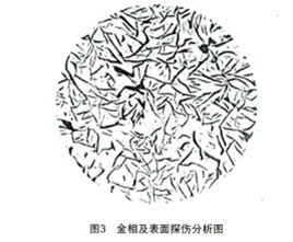 對(duì)不良產(chǎn)品中HT250材料進(jìn)行金相及表面探傷分析如圖3所示,檢測(cè)結(jié)果表明,材料質(zhì)量是在技術(shù)要求范圍內(nèi)的,為此又對(duì)加工中變化的情況及一些細(xì)節(jié)進(jìn)一步分析。通過(guò)對(duì)比試驗(yàn)發(fā)現(xiàn),之前考慮到提高粗糙度質(zhì)量,刀具更換為帶修光刃的刀片,此類刀具刀尖半徑相對(duì)較小(車刀刀尖隨著圓弧的增大,徑向力也相應(yīng)增大),為了減小徑向力,適當(dāng)減小了刀尖圓弧半徑,導(dǎo)致在加工過(guò)程中刀具磨損速度不穩(wěn)定,造成HT250材料中較粗石墨掉落現(xiàn)象,引起加工表面雖然產(chǎn)生了很多類似針孔,但探傷試驗(yàn)為合格的現(xiàn)象。