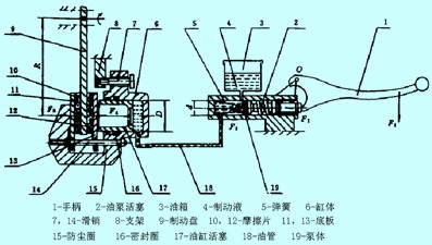 液壓摩托車制動圈(輪轂剎車圈是利用杠桿原理和帕斯卡定律,通過傳遞并增大操縱力對車輪產(chǎn)生制動轉(zhuǎn)矩和摩擦元件間的摩擦阻力,將行駛中摩托車動能轉(zhuǎn)化為摩擦熱能,再依靠摩擦元件吸收并釋放熱量,達(dá)到減緩車速或停車的目的。對制動手柄施加外力后,使手柄油缸中的制動液產(chǎn)生壓力并通過油管傳送到制動鉗一端的油缸活塞上,活塞推動摩擦片夾緊制動盤而使車輪產(chǎn)生制動[1]。由此可見,制動鉗的鉗口力決定著制動器的制動能力,而鉗口力與手柄位移和手柄力有關(guān)。所以必須從三個方面對液壓盤式制動器的性能進(jìn)行測試,即鉗口力、手柄位移和手柄力。液壓盤式制動原理圖如圖1所示。