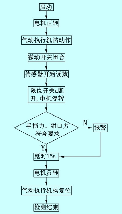 當(dāng)按下啟動按鈕后整個測試過程由plc控制自動進(jìn)行,氣動執(zhí)行機構(gòu)推動摩托車制動圈(輪轂剎車圈手柄進(jìn)行模擬制動,同時手柄力及鉗口力傳感器、手柄位移傳感器獲得的檢測模擬信號傳輸?shù)絧lc的模擬模塊,plc通過rs485/232接口與上位機通信,plc把傳感器的模擬信號轉(zhuǎn)換成數(shù)字信號傳輸?shù)缴衔粰C,顯示器上分別顯示手柄力及鉗口力的大小和手柄位移等參數(shù)和對應(yīng)的曲線,當(dāng)設(shè)定電機運行時間結(jié)束時電機停止且反轉(zhuǎn)使氣動執(zhí)行機構(gòu)復(fù)位,極限開關(guān)起限位保護(hù)作用,當(dāng)氣動執(zhí)行機構(gòu)推動手柄與極限開關(guān)接觸時,電機自動停止,若有檢測結(jié)果超出設(shè)定合格值,報警器會及時報警。