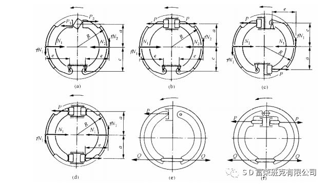 (a)領(lǐng)從蹄式(用凸輪張開);(b)領(lǐng)從蹄式(用制動(dòng)輪缸張開);(c)雙領(lǐng)蹄式(非雙向,平衡式);(d)雙向雙領(lǐng)蹄式;(e)單向增力式;(f)雙向増力式