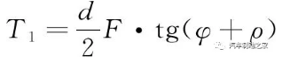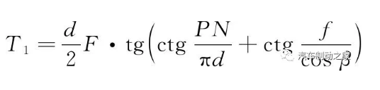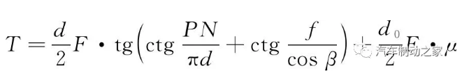 目前市場EPB制動鉗主要采用兩種傳動方式,一種是螺紋傳動,另一種是滾珠絲桿轉動;這兩種均屬于螺旋轉動,由螺桿與螺母組成,是通過螺桿和螺母的旋合傳遞運動和動力的。它主要是將旋轉運動變成直線運動,以較小的轉矩得到很大的推力。螺紋傳動的特點是:結構簡單,加工方便;易自鎖;螺紋有側向間隙,反向時有空行程,定位精度和軸向剛度較差;摩擦阻力大,傳動效率低;磨損快;滾珠絲桿傳動的特點是:摩擦阻力小,傳動效率高;結構較復雜,制造工藝要求高,成本較高;運動平穩(wěn),啟動時無振動;壽命長;不自鎖,要求自鎖時需附加自鎖裝置。考慮到成本和自鎖,除了大陸采用滾珠絲桿結構外,其他制動器廠均采用螺紋傳動結構。Table 4 Thread parameters of threaded transmissionFig.3 Force analysis diagram of thread令f′=f/cos β稱當量摩擦系數(shù)。與當量摩擦系數(shù)對應的摩擦角稱為當量摩擦角,用ρv表示。d0——推力軸承滾針中經(jīng) [mm](滾針的中心位置,取22.6 mm)μ——為推力軸承摩擦系數(shù)(帶保持架滾針軸承:0.0020~0.0030,取0.0025)由(8)、(9)上式可得EPB制動鉗輸入力矩T為:因此,空載、滿載時汽車在20%和30%駐坡所需要的執(zhí)行機構輸入力矩見表5。表5 空載、滿載時在20%和30%駐坡卡鉗輸入力矩Table 5 Caliper input torque at 20% and 30% ramp when GCW or GVW 單位:Nm