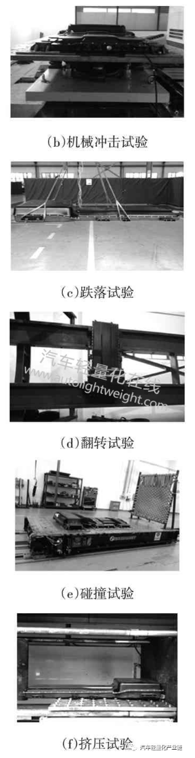 電池包的安全性能測試包括擠壓、碰撞、短路保護、濕熱循環(huán)、鹽霧以及外部火燒等多類檢測項目,但本次優(yōu)化設(shè)計僅對電池包不同結(jié)構(gòu)件的材料、厚度或幾何特征進行了變更,并未改變電池包內(nèi)部的電氣電路、溫控系統(tǒng)和各結(jié)構(gòu)件之間的連接關(guān)系,因此,只進行與電池包結(jié)構(gòu)性能要求相關(guān)的幾類測試,如圖9所示。