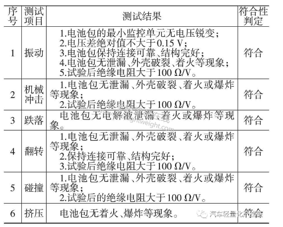 由檢測結(jié)果可知,優(yōu)化后的電池包實體在6項檢測中未出現(xiàn)起火、爆炸、電解液泄漏以及短路等問題,各項安全性能指標均滿足國家標準要求。試驗結(jié)果表明,優(yōu)化后的電池包仍具有良好的安全性能,該優(yōu)化設(shè)計方案可行。